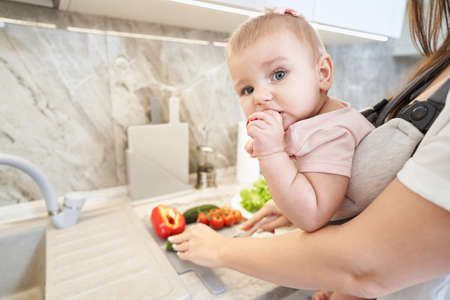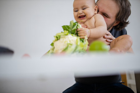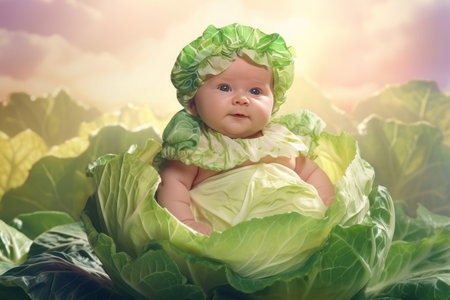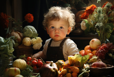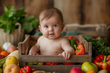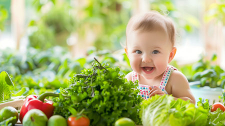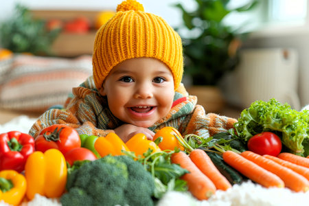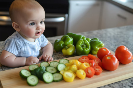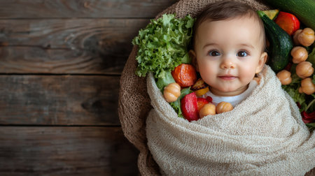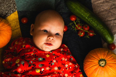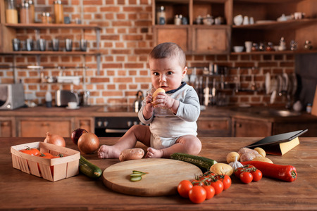cute baby boy lying on kitchen table near group of vegetables on chopping board
