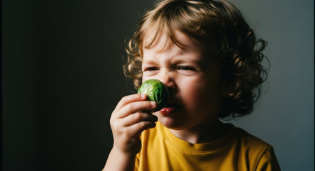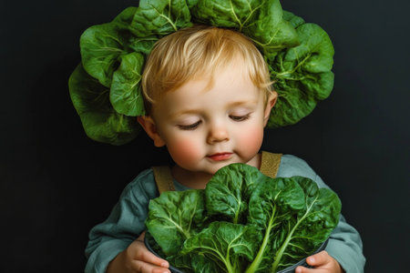 A studio shot of a boy holding a fresh broccoli. The concept of healthy baby food. Space for your text