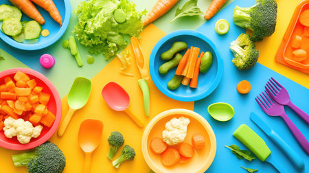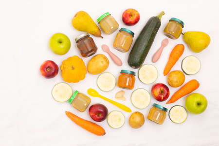 Layout of Puree for baby food with vegetables and fruits. Selective focus. nutrition. The first complementary feeding of the child. A happy child. A well-fed child. Copy space. Article about baby food
