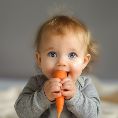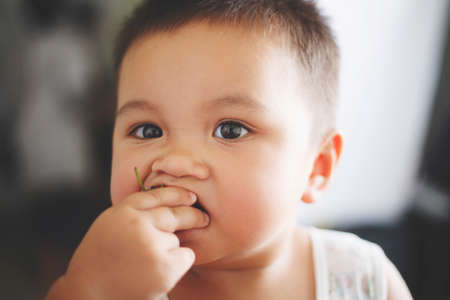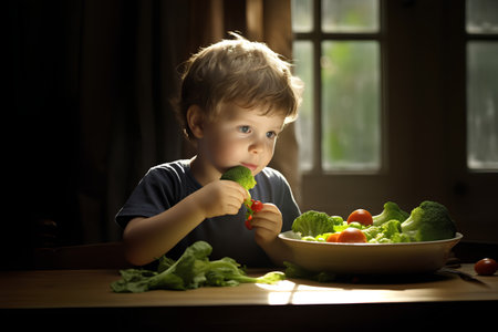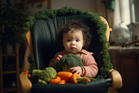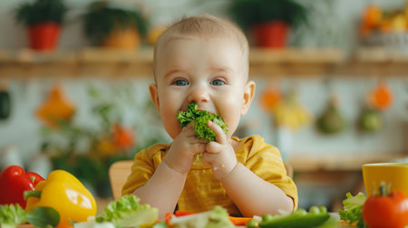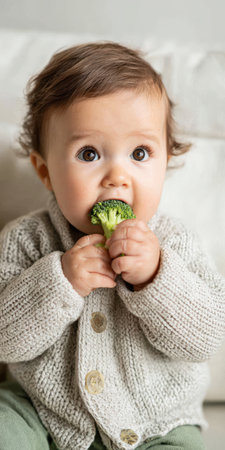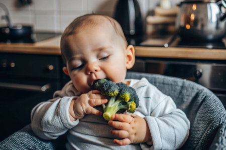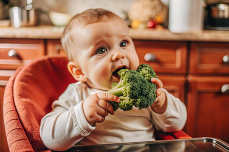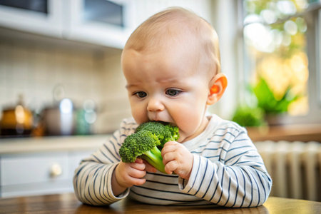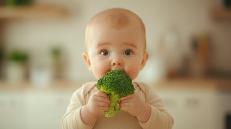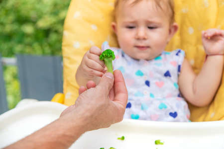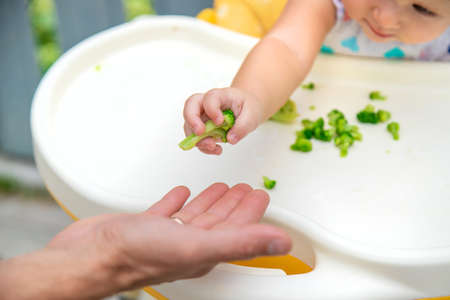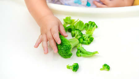 Baby eats pieces of broccoli vegetables. Selective focus. Child.