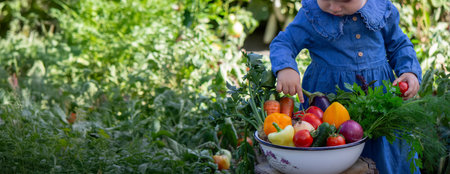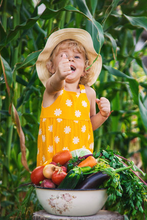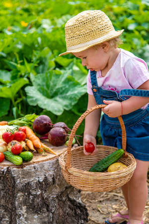 A child is harvesting vegetables in the garden. selective focus. Food.