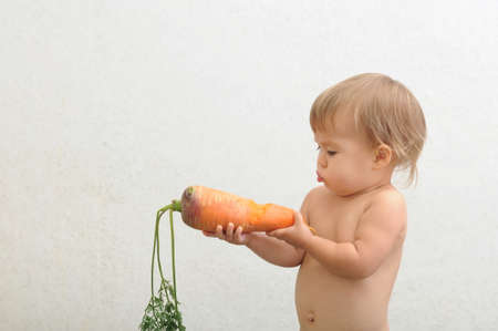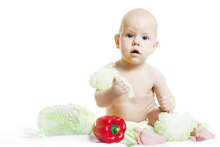 Naked baby in diaper is playing with fresh organic vegetables and fruits isolated on a white background. Little kid biting a fresh green head of cabbage. Healthy food for children concept.