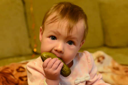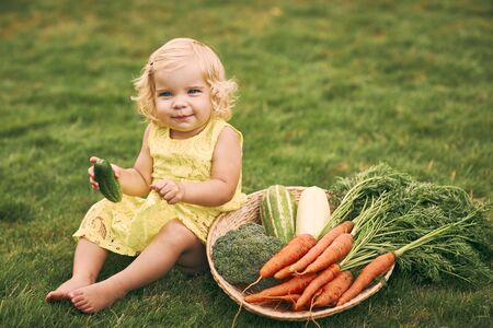 A little blond girl in a yellow dress, barefoot, holds a cucumber in her hand, sits next to a large basket of vegetables on the grass.Healthy food, green vegetarian food.