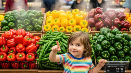 Cute baby girl are sitting with pepper white background interior. Funny child explores vegetable