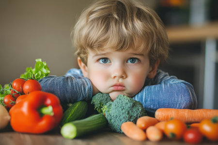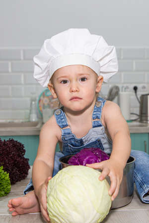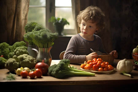 boy sitting on kitchen table around of raw vegetables before cooking a dinner