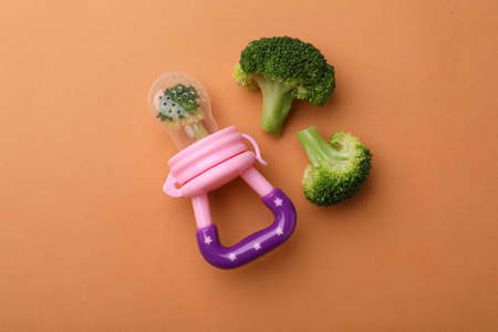 Nibbler with boiled broccoli on pale orange background, flat lay. baby feeder
