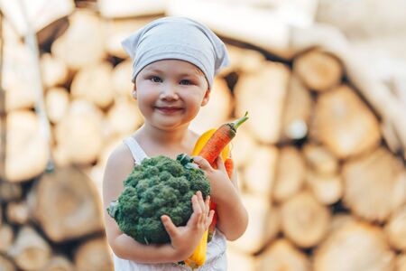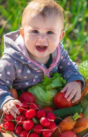 A child with a harvest of vegetables in the garden. selective focus. food.