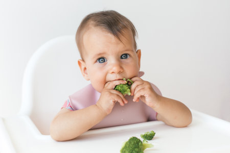 one baby little girl 8 months old sits in a high chair on white background and eats complementary foods green broccoli, close-up portrait looks at the camera. baby food concept