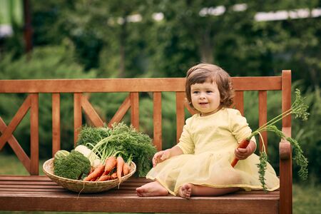 Little curly girl in a yellow dress, barefoot, holds a carrot in her hand, sits on a bench next to a large basket of vegetables with zucchini, carrots and broccoli.Healthy food, green vegetarian food.