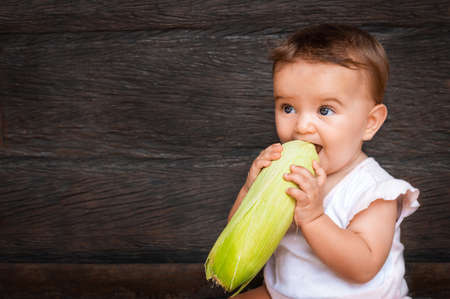The baby holds in his hands a lot of vegetables harvest from the garden. Selective focus. Food.
