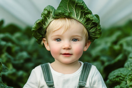 long banner litle happy smiling farmer boy in white overalls and grey hairband holding fresh organic vegetables in hands. garden, harvest season.