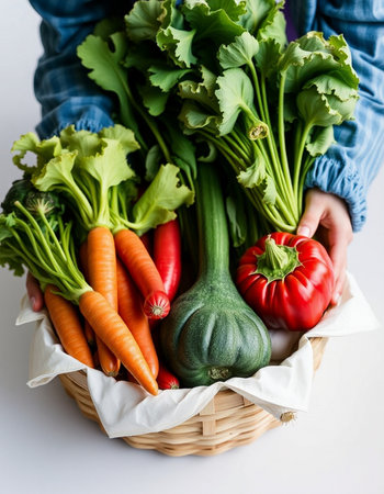 Summer, autumn harvest. Fresh organic farm vegetables in a wooden box on a white marble table - beets, carrots, parsley, tomatoes. Copy space top view