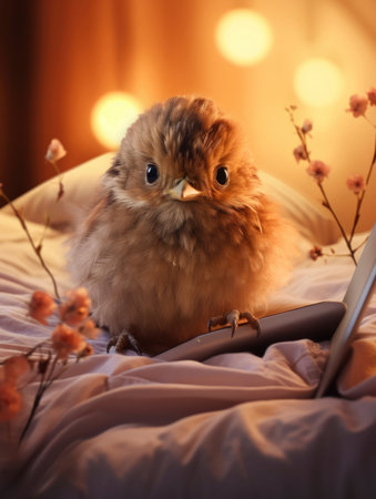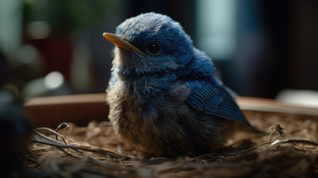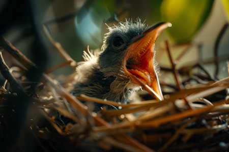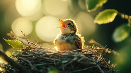 An enchanting shot of a baby bird chirping from its nest at dawn, with soft morning light illuminating its delicate features, evoking a sense of new beginnings.
