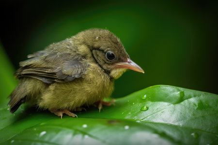 A charming close-up of a fluffy baby bird perched on a branch, surrounded by vibrant green leaves, capturing the innocence and beauty of nature in springtime.