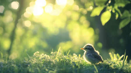 A tiny fledgling sits nestled in its carefully woven home, bathed in the warm, golden glow of the morning sun. It waits patiently, a symbol of new life, hope, and the fragile beauty of a new beginning in the natural world.