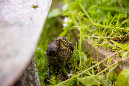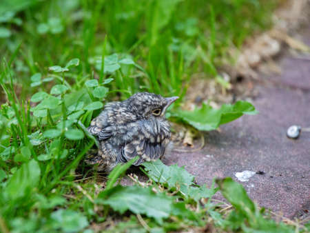 A baby common blackbird fallen from its nest hidden in the green yellow grass. High quality photo