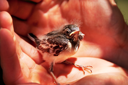 Cute baby bird (Zebra Finch) on a human hand, shallow DOF with selective focus on the baby bird head
