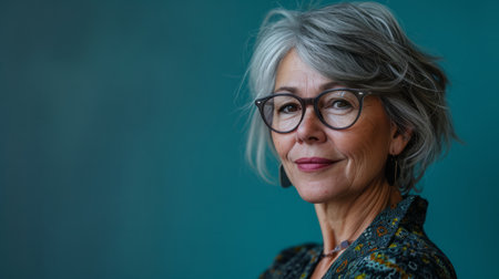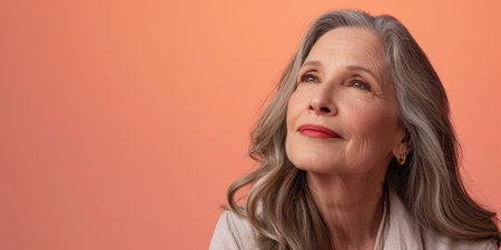 Elegant elderly woman with gray hair and a thoughtful expression, standing in front of a textured concrete wall.