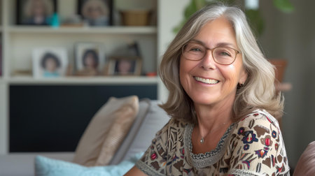 Happy mature Caucasian woman sitting relaxed at home in living room.