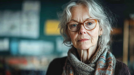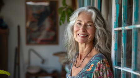 Portrait of elderly woman with gray hair, looking thoughtfully out of window, showcasing serene expression and elegant attire, capturing moment of reflection and wisdom
