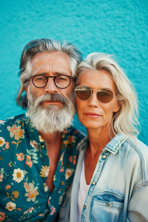A man and a woman are posing for a picture. The man is wearing a floral shirt and the woman is wearing a blue jacket. They both have sunglasses on and are smiling. Scene is lighthearted and fun