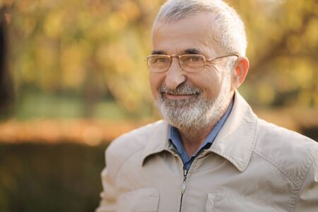 Close up of handsome bearder elderly man put on glasses. Gray haired old man in the park