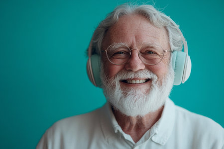 Cheerful portrait of a smiling grandpa with headphones, mint background, minimalistic vibrant, showcasing a love for life