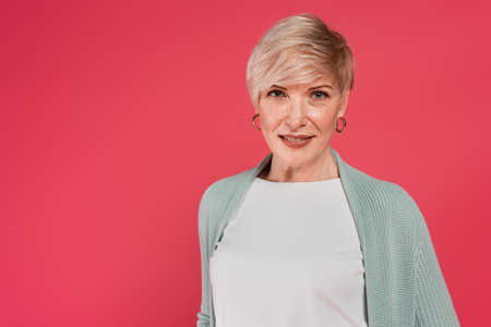 ash-blonde, middle aged woman smiling at camera isolated on pink