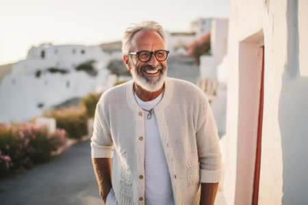 Portrait of a senior man walking in the streets of Mykonos, Greece