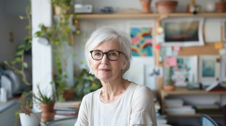 A joyful senior woman with gray hair in glasses smiles warmly, surrounded by colorful art, radiating happiness and positivity in her friendly environment.