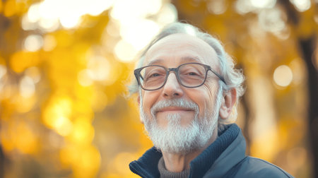 An elderly man with glasses and a gray beard smiles warmly in a picturesque autumn park, surrounded by colorful leaves and soft, blurred lights.