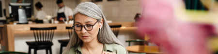 Mature grey woman in earphone working with laptop and papers at cafe indoors