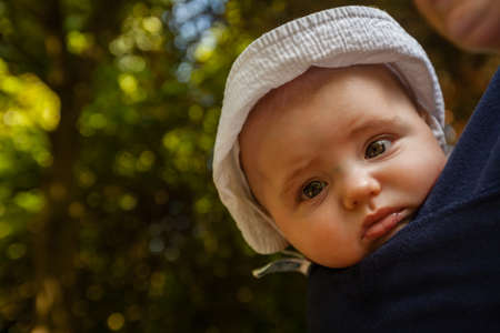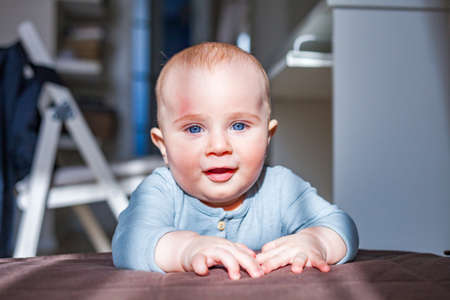 Cute little baby boy with the big brown eyes. Sweet infant at home