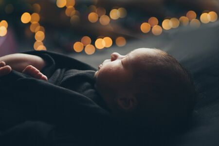 portrait of a little girl: baby's face close-up on balck background. boce as background concept of childhood, healthcare, IVF, Christmas, new year holidays