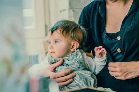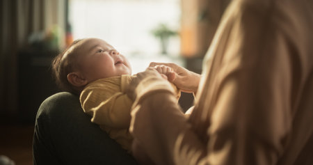 Portrait of a Cute Asian Baby Resting on her Mother's Lap, as She Holds Her Hands. Active Little Toddler Cooing and Trying to Communicate, Looking at her Mother with Big Eyes Full