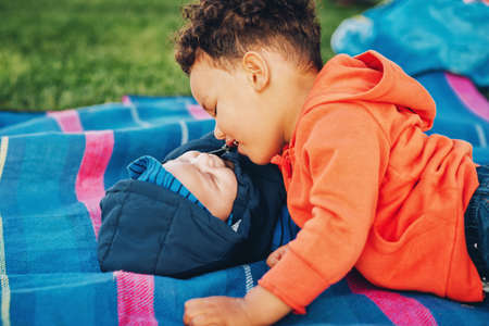 Portrait of two funny brothers playing utside, baby and toddler boys having fun together on a nice sunny day