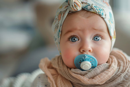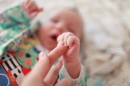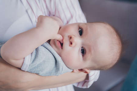 Portrait of attractive adorable innocent cute sweet healthy baby several days old licking finger at home indoors