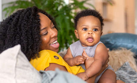 African american mother playing with adorable little african american baby in a white bedroom.Love of black family concept