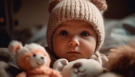 Smiling baby boy in knit cap plays with teddy bear generated by artificial intelligence
