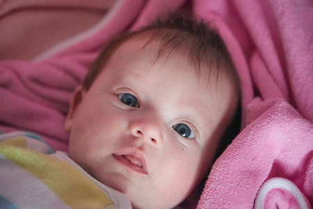 Close-up detail portrait of cute little peaceful newborn baby boy child face with beautiful open eyes. Love and family emotion