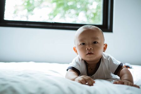 Adorable newborn kid during tummy time smiling happily at home.Portrait of cute smiling happy asian baby boy crawling on bed on the white blanket in bedroom.