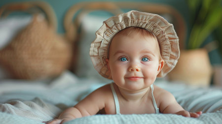 Cute baby with innocent blue eyes looking at camera happily generated by artificial intelligence
