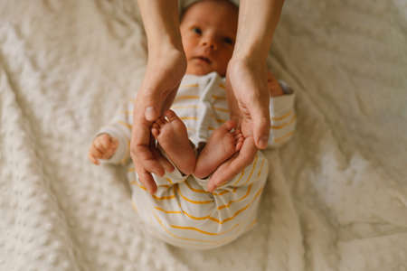 Mom lies with a newborn baby, top view. Close up. The concept of motherhood and child development.