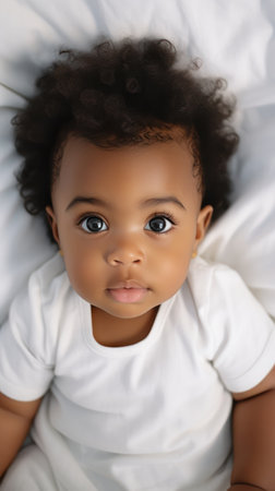 Tiny explorer: An endearing African American baby sitting on a white bed, looking at the camera.