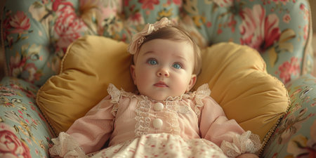 A close-up portrait of a baby girl with blue eyes lying on a yellow blanket She is wearing a yellow dress AI Generative