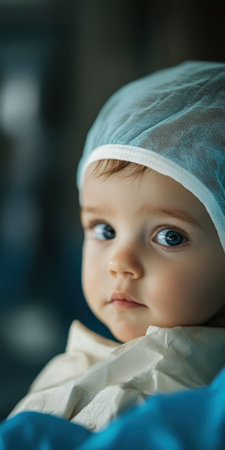 Adorable Caucasian Baby in Blue Cap and Medical Gown Looking Curious.