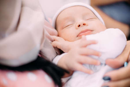 A close-up shot of the happy newborn baby that her happy mother is holding in her hands at home. The smiling infant and the mom in the sunlight in front of the window in the evening.