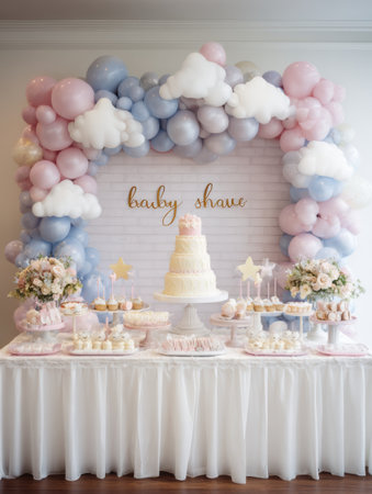 Setup shows a decorated dessert table for a Baby Shower. Balloons in pink, blue, and white form an arch.