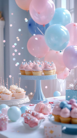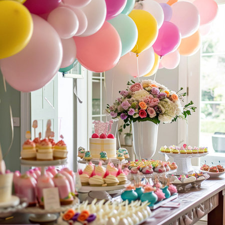 Birthday tablescape or candy bar with sweets, Birthday cake and cupcakes, beautiful party and celebration
