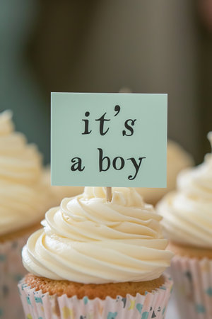 Baby Shower Cupcake with Its a Boy Card on Stick Celebration Concept.